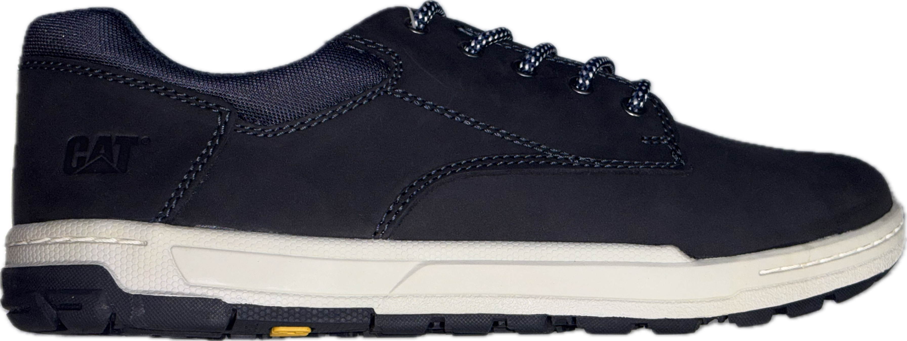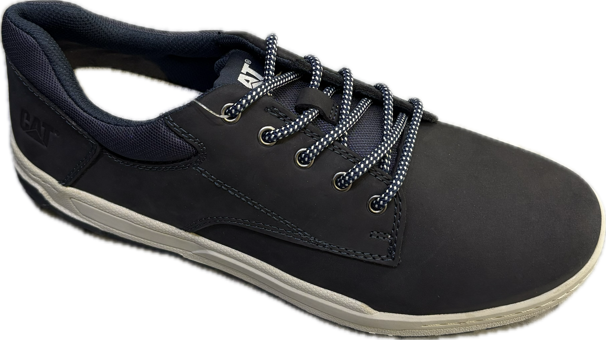 بندهای دو رنگ سفید و سرمهای از طریق پنج حلقه فلزی به کفش مردانه CAT Colfax متصل میشوند تا آن را محکم کنند.